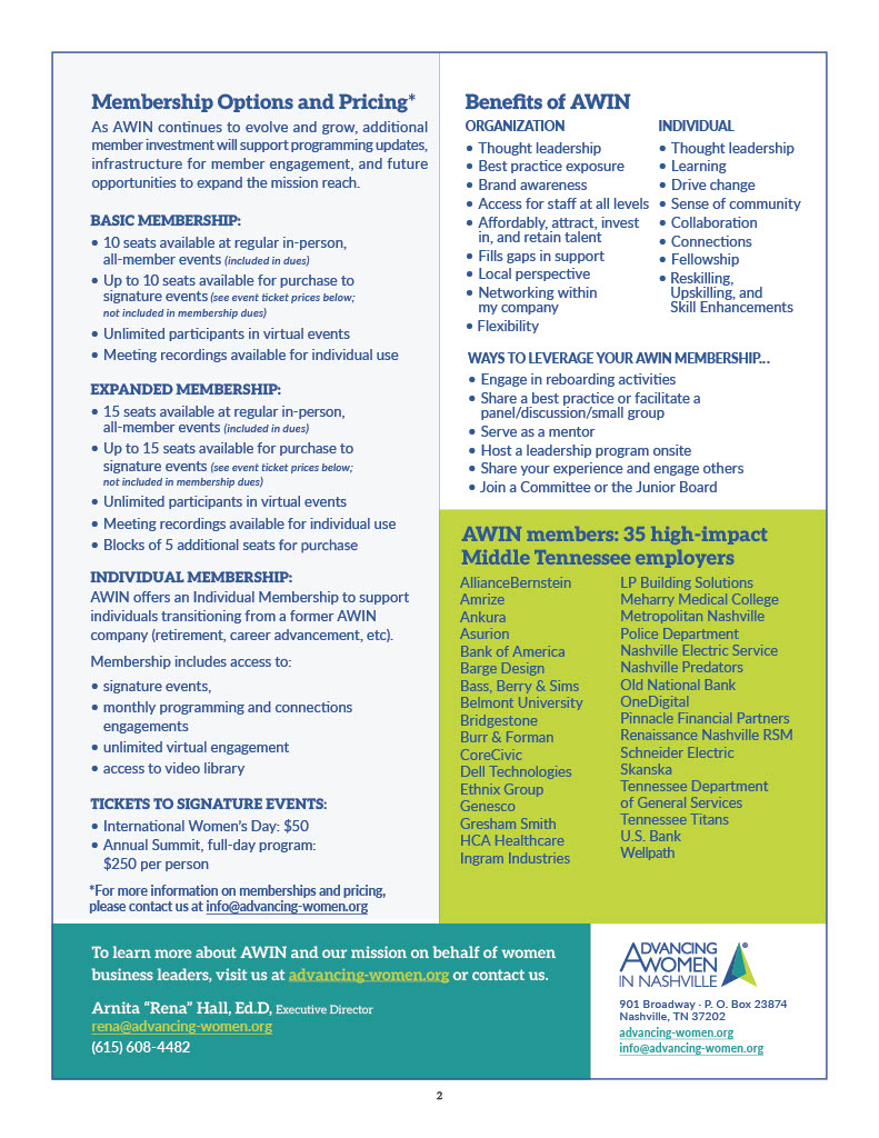 AWIN is a group of major middle Tennessee employers who invest in supporting their women leaders through membership and active engagement in our mission.